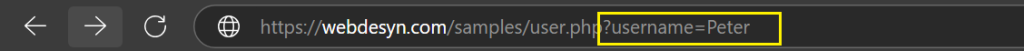 When you click Get my data the form redirects you to the processing page. Note the ?username=Peter in the URL of the processing page. These are called query parameters and hold the inputted data.